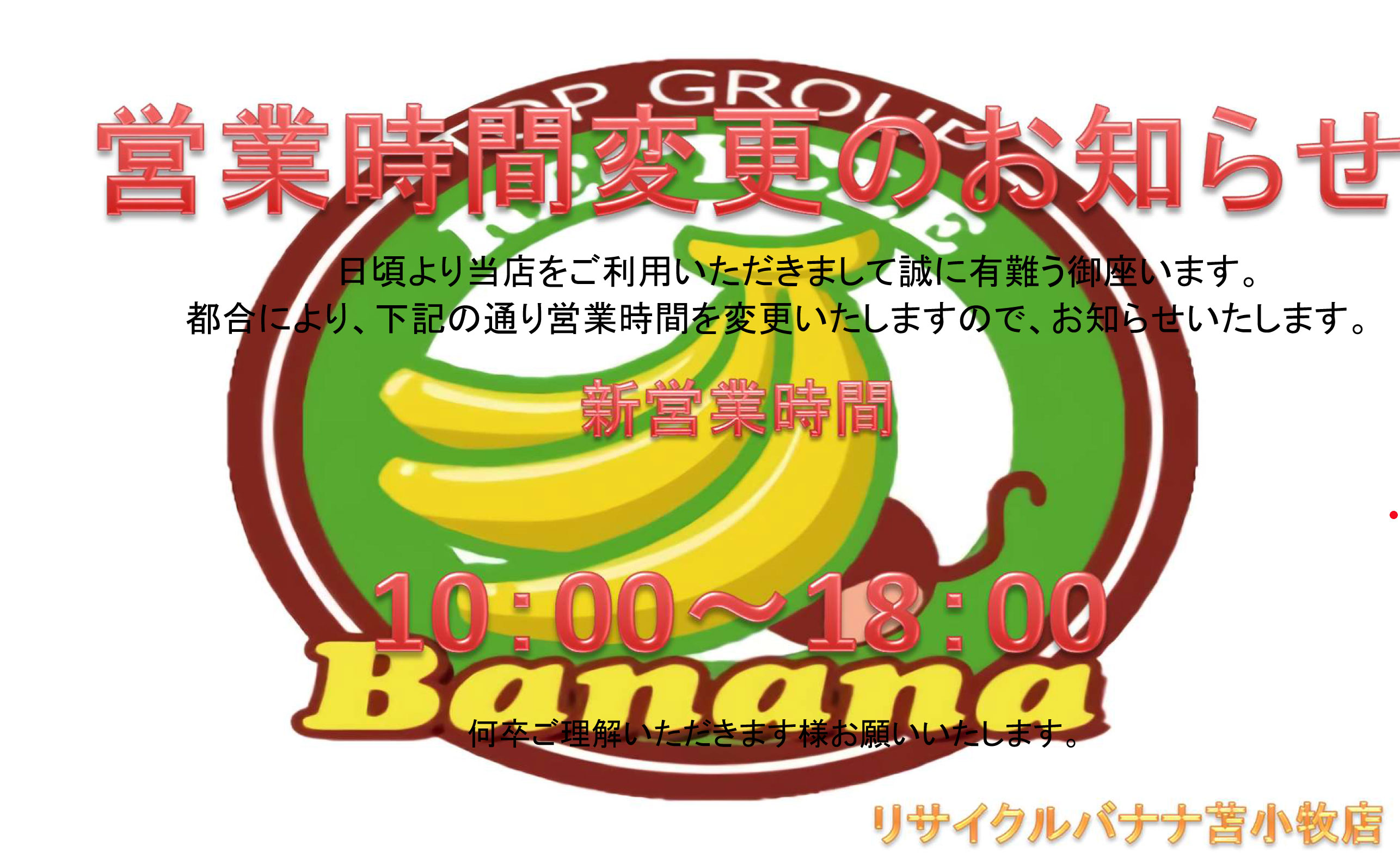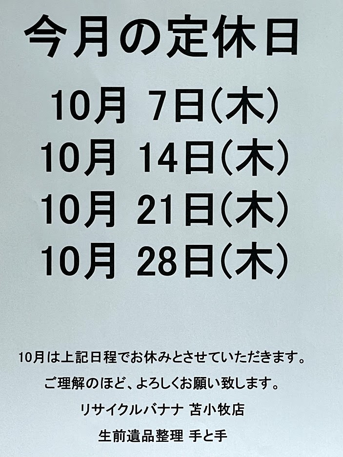 <リサイクルバナナ苫小牧店>10月の定休日のお知らせ!また、営業時間が変更されました。